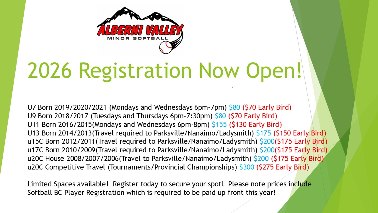 Alberni Valley Minor Softball offers a fun and inexpensive way to stay active and develop both sport and life skills. All you need is a glove, helmet (with a cage for U10 and up) and appropriate shoes - bats, balls, catchers gear and uniforms are provided. Pitchers must also have a field mask. If you are 5 years or older come join today.